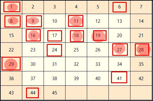 위의 이미지는 한동안 공개되지 않은 수치입니다. 여기서 권장하는 숫자는 1, 6, 16, 18, 28, 41입니다. 위의 두 가지 방법에서 공통 부분을 찾아 예상되는 로또 번호에 1060배를 늘립니다. 제가 추천하는 1060 로또 예상번호 15개를 복권용지에 표시해두었습니다. 확인해보니 25보다 작은 숫자가 많네요. 이번주 로또 1060차는 25이하 숫자가 많을 것 같아서 숫자가 낮은 숫자를 주로 고를 생각입니다. 그리고로또 당첨 번호도 같이 나올 것 같고, 연속 번호도 나올 것 같아요.