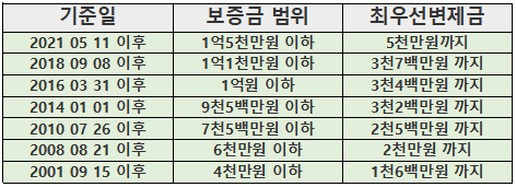 보통 전세 계약의 경우 위 보증금을 초과하는 경우가 많을 것입니다.하지만 월세 계약, 그리고 반전세의 경우도 보증금이 클 수 있기 때문에 확인해야 합니다.또 하나 중요한 건 지금이 2022년이라고 마지막 기준금액만 확인해서는 안 된다는 사실, 이 부분을 놓치시는 분들이 많이 있습니다.제가 일하다 보면 공인중개사 사무실에서도 이 부분에 대해서 잘 모르시는 분들이 있는데 지금 계약을 하더라도 2010년 기준금액을 확인해야 할 때도 있습니다.그 이유는 등기부상 최초 설정된 담보권을 기준으로 보기 때문입니다.예를 들어 지금 계약을 하더라도 근저당권이 그 전에 설정되어 있다면 그 근저당이 설정된 구간에서의 최우선변제금액을 확인해야 하고, 내 보증금이 그 금액을 초과한다면 우선변제권까지 고려해야 합니다.다시 말해, 이 경우에는 확정일을 반드시 받아야 합니다.