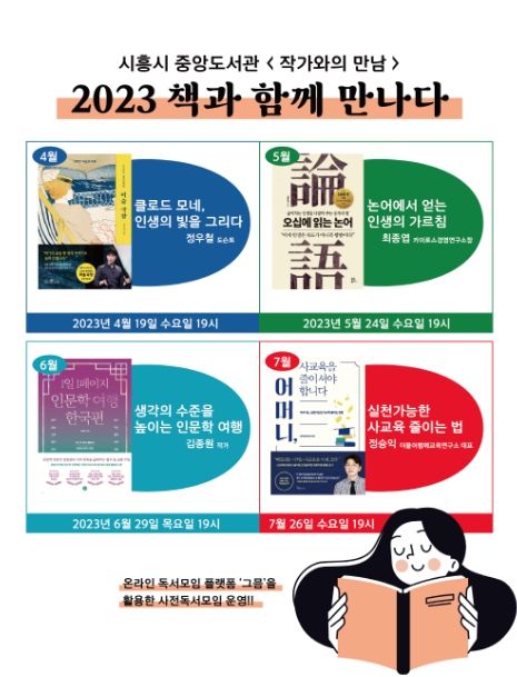 시흥중앙도서관은 시민들이 작가와의 만남과 소통의 기회를 통해 독서 흥미를 자극할 수 있는 ‘2023 책과의 만남’ 사업을 시작했다. 이에 따라 4월부터 7월까지 매월 1회 정기적으로 다양한 주제의 작가들을 초청하여 작품에 대한 이해를 심화시키기 위한 대면 강연을 진행하고 있다. 특히 올해부터는 온라인 독서플랫폼(금)을 통해 사전독서회를 시범 운영하여 일상 독서의 길잡이가 되는 일회성 강의를 독려할 예정이다. 월간 “책을 만나다” 발표 일정과 주제는 다음과 같습니다. ▲4월 19일<郑宇哲导览艺术剧场>정지허 “클로드 모네의 생명의 빛 그림” ▲5월 24일<五十岁读论语>최종계 “생활의 논어” ▲ 6월 29일 “한국 인문여행, 1페이지 1일” 김종원 작가 “사고력 향상을 위한 인문학 여행” ▲ 7월 26일 “엄마, 개인교육 줄여야지” 정청이 작가 “사교육의 실천적 방법 축소” 월간교육은 중앙도서관 다목적실에서 19시부터 발간되었습니다. 각 강의당 선착순 50명을 모집하며, 4월 19일 강의 신청은 4월 4일부터 시흥중앙도서관 홈페이지를 통해 할 수 있다. 강연 참여를 원하는 시민은 추후 공지되는 도서관 홈페이지(http://lib.siheung.go.kr)에서 자세한 내용을 확인하거나 중앙도서관(031-310-5222)으로 문의하면 된다.시흥중앙도서관 홈페이지 바로가기