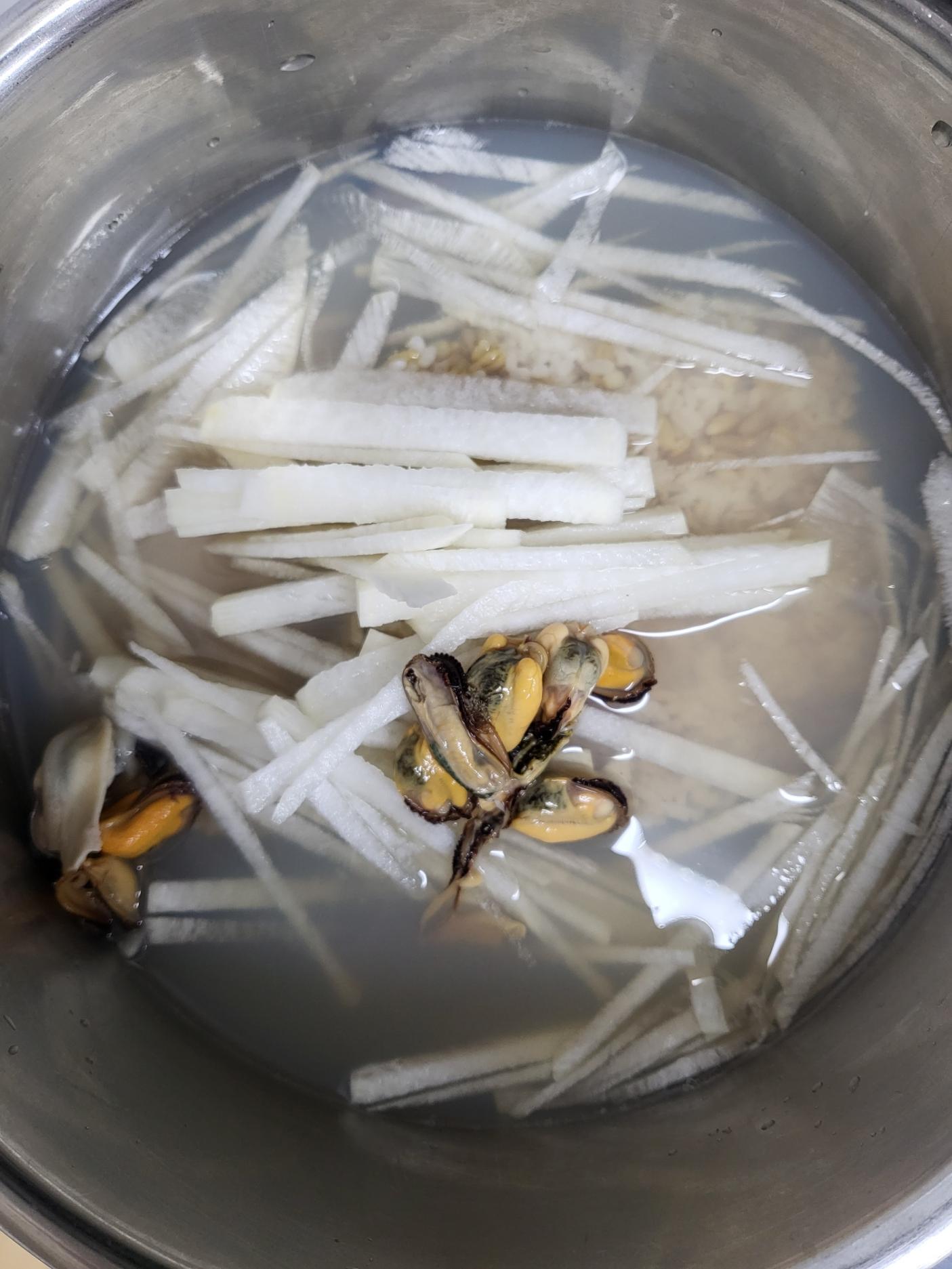 간 무와 바지락을 넣고 끓여주니 한끼 식사로 딱입니다.