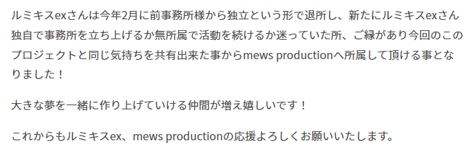Lumikis Ex 씨는 이전 사무실에서 독립하는 형태로 올해 2월 퇴사하였고, Rumikis Ex 씨는 독립적으로 새로운 사무실을 시작할 것인지, 독립하여 활동을 계속할 것인지에 대해 고민하고 있으며, 인연이 있고, 시간적으로는 이 프로젝트와 동일합니다. 감정을 공유할 수 있기 때문에 Mews Production의 일원이 되었습니다!